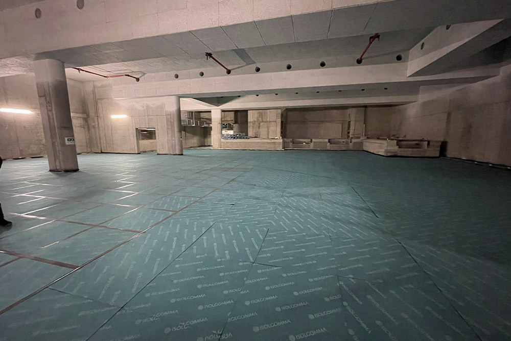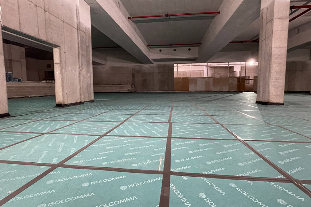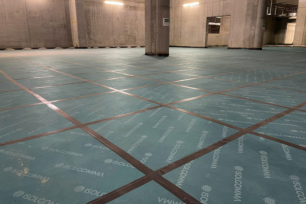 Afin de répondre aux besoins de construction du client et aux problèmes de vibrations causés par les véhicules en transit pour le chargement et le déchargement des marchandises, une solution anti-vibration a été proposée avec des panneaux Isolgomma posés en continu sous chape. L’utilisation de MEGAMAT 25/650 a permis de contrôler les vibrations, évitant ainsi leur transmission aux structures sus-jacentes.