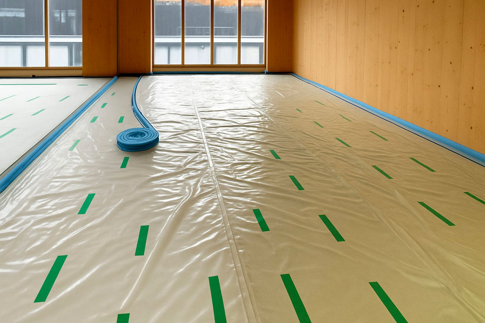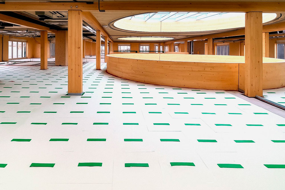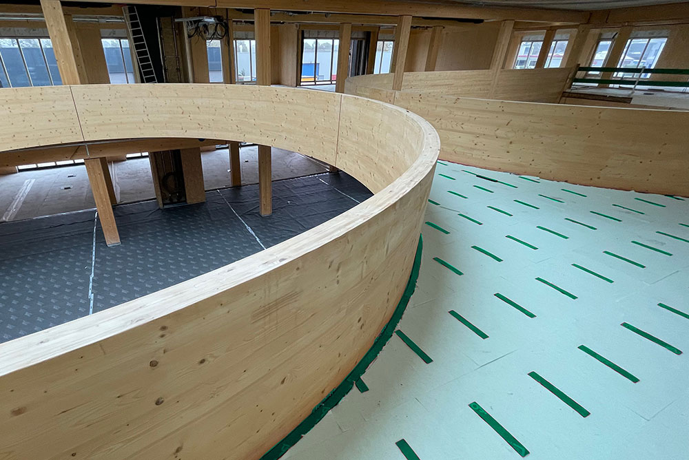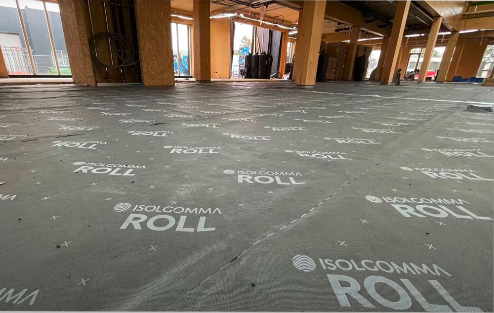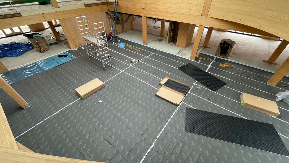 Afin de garantir le confort acoustique nécessaire, notre partenaire ISMT B.V. a proposé l’utilisation du système HIGHMAT 20, composé de deux supports en caoutchouc insérés dans un tapis en fibre de polyester. Ce système acoustique a été inséré dans une stratigraphie constituée d’une chape d’anhydrite et d’un film PE, posés sur les planchers CLT. La solution a été choisie pour son efficacité à réduire les bruits d’impact, sa facilité d’installation et sa compatibilité avec des structures légères comme celles en bois. De plus, pour le rez-de-chaussée, le produit de la ligne ROLL a été choisi en combinaison avec un chauffage par le sol pour réduire les bruits de piétinement horizontalement.