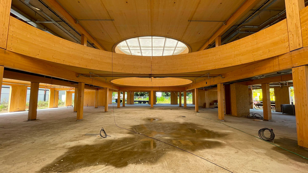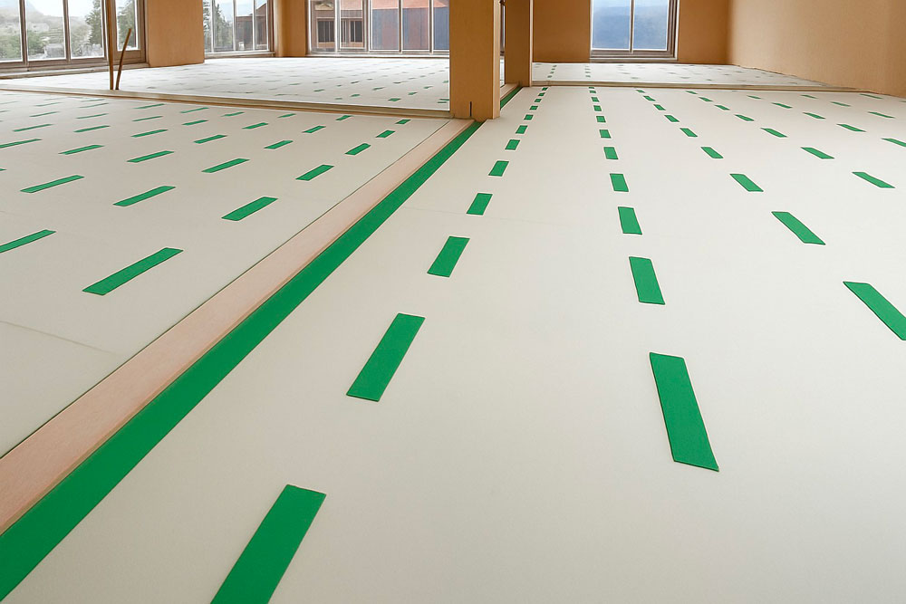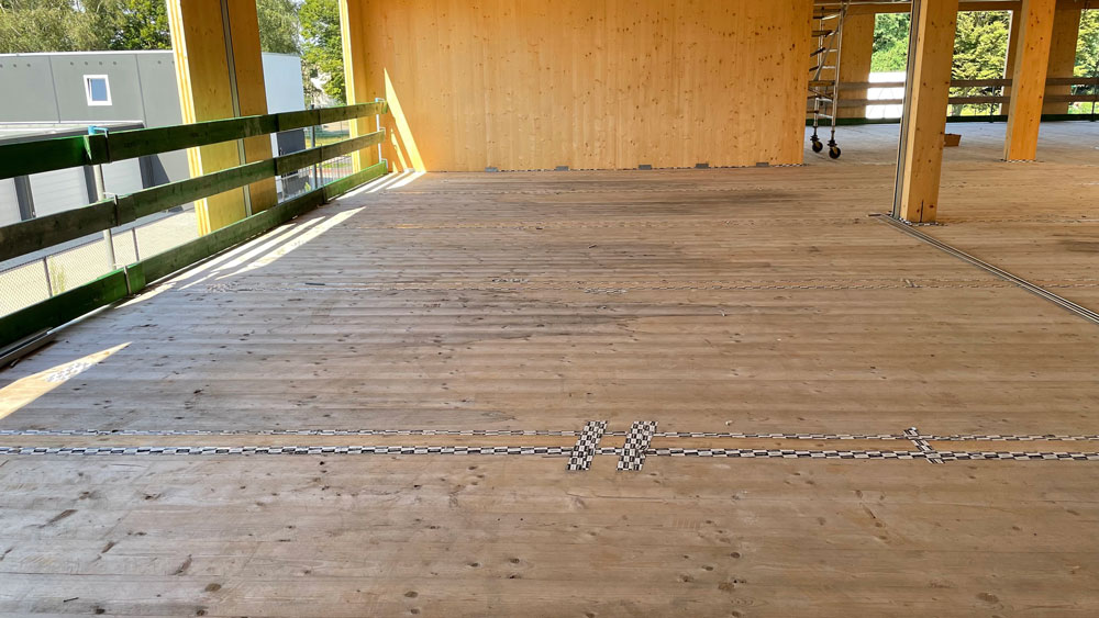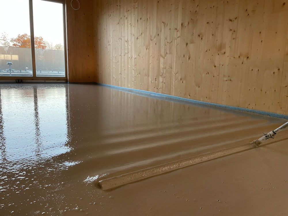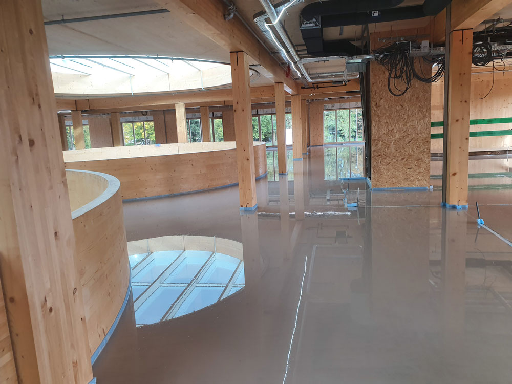 Afin de garantir le confort acoustique nécessaire, notre partenaire ISMT B.V. a proposé l’utilisation du système HIGHMAT 20, composé de deux supports en caoutchouc insérés dans un tapis en fibre de polyester. Ce système acoustique a été inséré dans une stratigraphie constituée d’une chape d’anhydrite et d’un film PE, posés sur les planchers CLT. La solution a été choisie pour son efficacité à réduire les bruits d’impact, sa facilité d’installation et sa compatibilité avec des structures légères comme celles en bois. De plus, pour le rez-de-chaussée, le produit de la ligne ROLL a été choisi en combinaison avec un chauffage par le sol pour réduire les bruits de piétinement horizontalement.